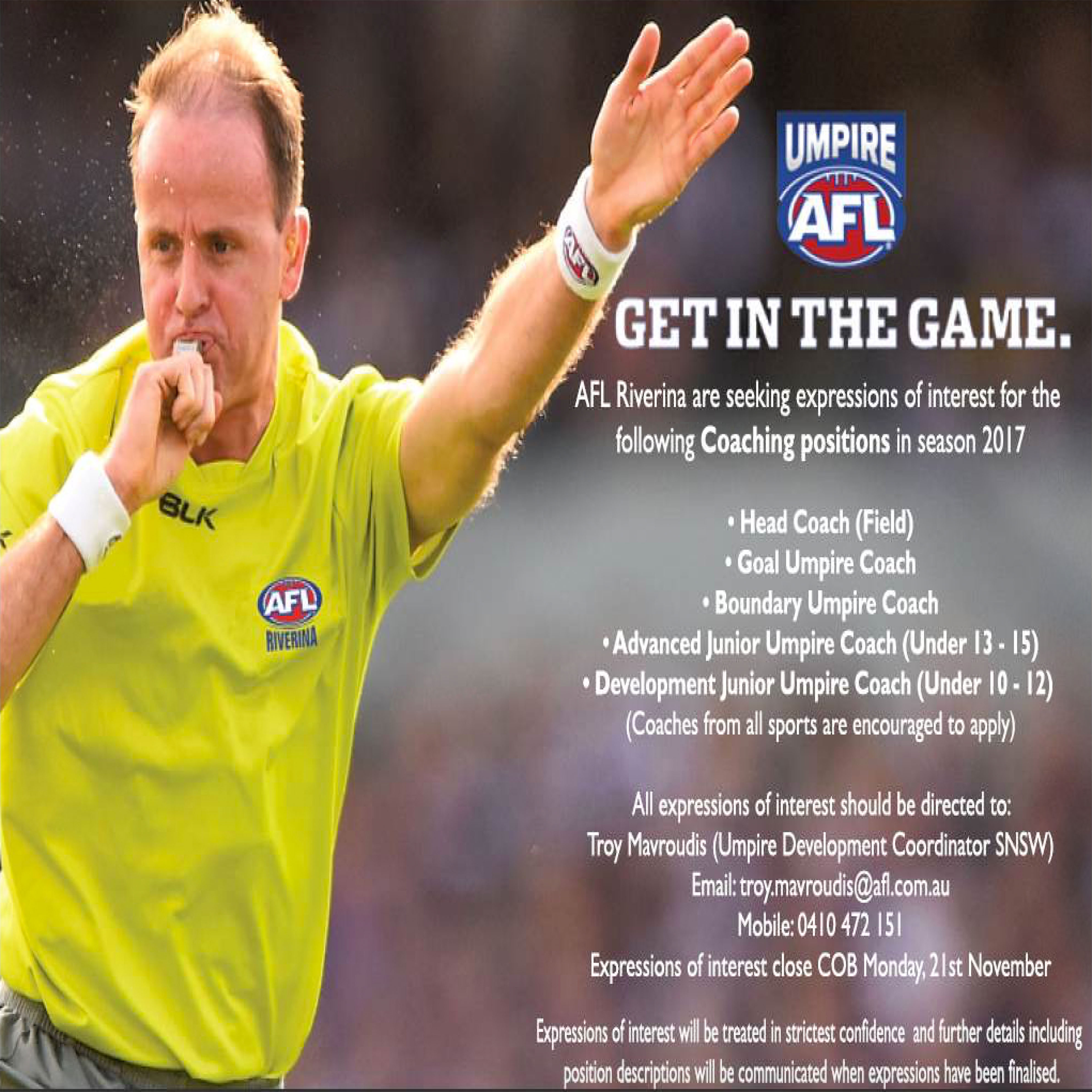 All expressions of interest should be directed to Troy Mavroudis (Umpire Development Cordinator SNSW) Email:troy.mavroudis@afl.com.au Mobile:0410 472 151