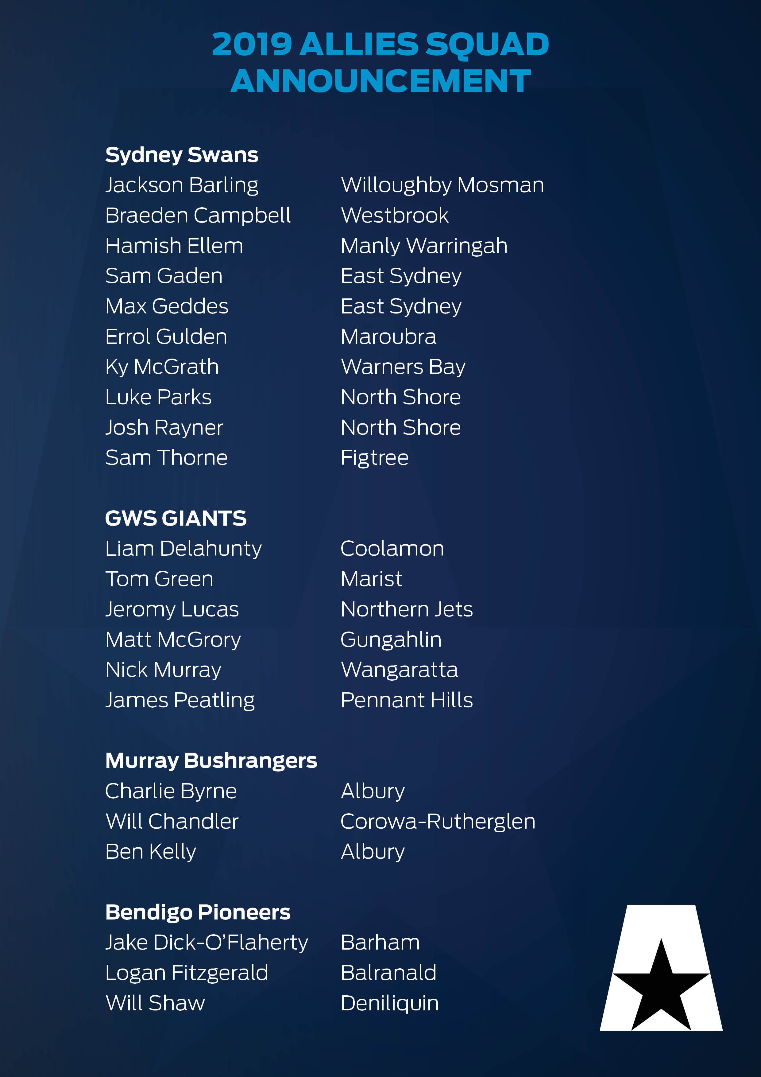 In recent years, the Allies have produced such AFL players as Isaac Cumming (GIANTS), Nick Blakey (Sydney Swans), Charlie Spargo (Melbourne), Harry Perryman (GIANTS) and Todd Marshall (Port Adelaide).