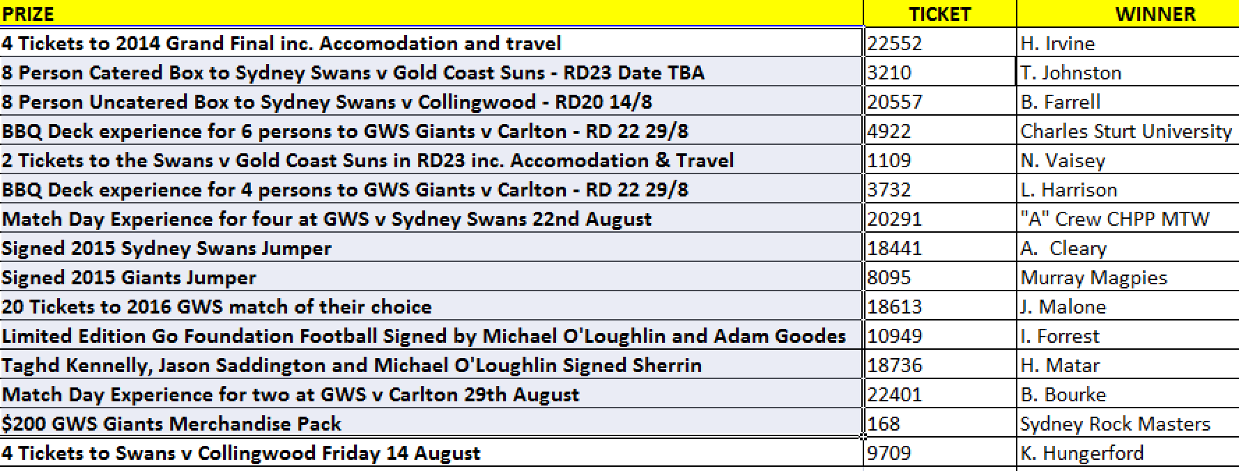 2015 AFL NSW/ACT COMMUNITY RAFFLE WINNERS