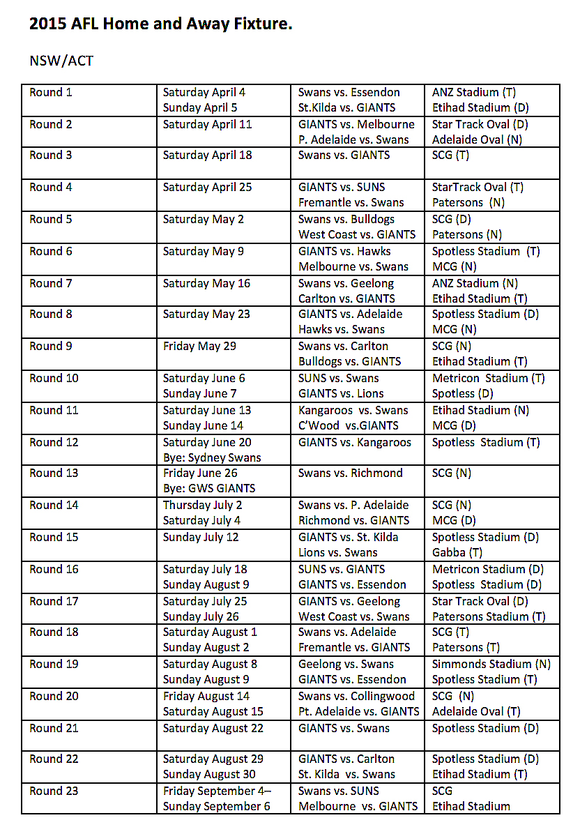 Full 2015 Swans and GIANTS fixture
