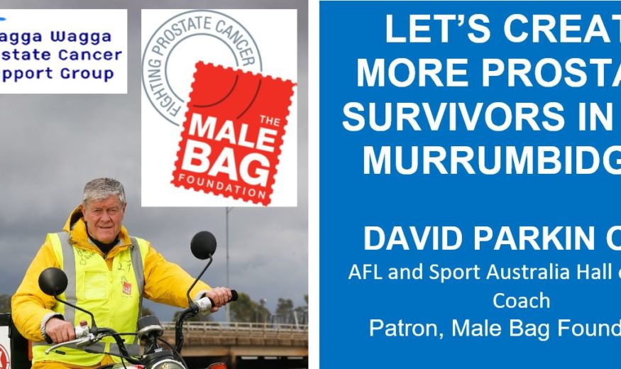 Invitation to Murrumbidgee Health Care District Join the Male Bag Foundation & Wagga’s Prostate Cancer Support Group on 25 October 2018. LET’S CREATE MORE PROSTATE SURVIVORS IN THE MURRUMBIDGEE DAVID PARKIN OAM AFL and Sport Australia Hall of Fame Coach…