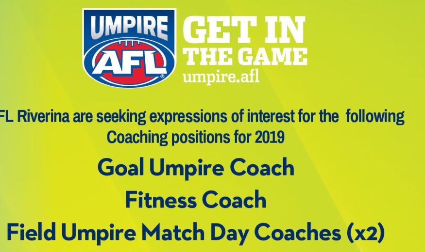 AFL Riverina are seeking expressions of interest for the following Coaching positions for 2019: Goal Umpire Coach Fitness Coach Field Umpire Match Day Coaches (x2) All expressions of interest should be directed to: Troy Mavroudis (Umpire Development Coordinator SNSW) troy.mavroudis@afl.com.au |…