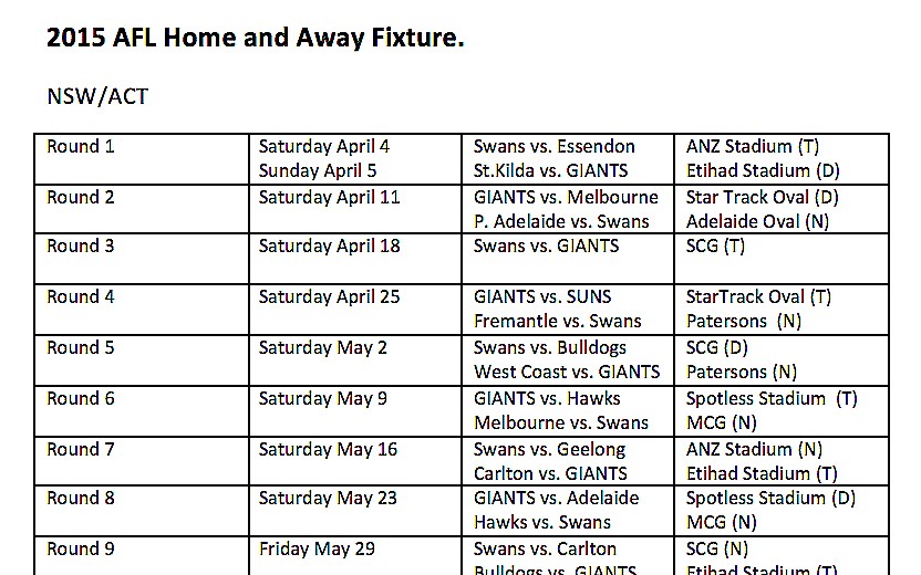 The AFL yesterday announced the 2015 AFL Premiership season fixture, with three matches on ACT soil, and a further 19 games to be played in NSW.