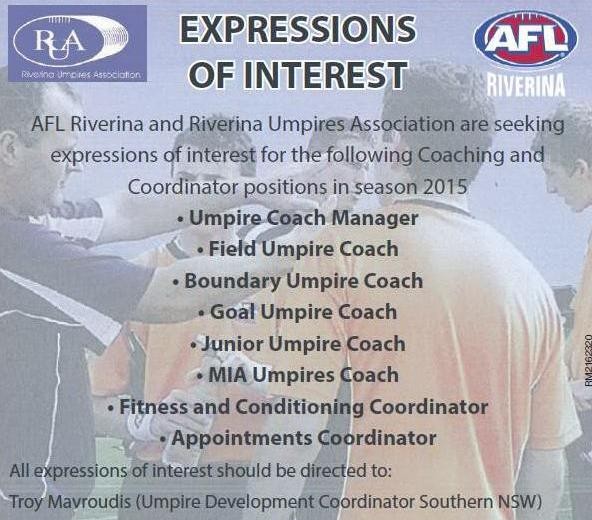 AFL Riverina and RUA are seeking expressions of interest for Umpire Coaching and Coordinator positions in season 2015.
