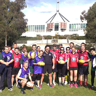 The AFL 9s season in the ACT was launched at Parliament House with members of Parliament, advisors and even a couple of Chiefs of Staff joining Premiership winning Geelong captain Tom Harley and Hawthorn Brownlow medallist Robert DiPierdomenico on the lawns for a game.