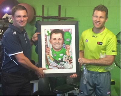 So how do we then celebrate Troy’s career in an appropriate manner?  We wait until last Saturday and present his caricature to him after the NAB Challenge game in Lavington, where Troy was working.