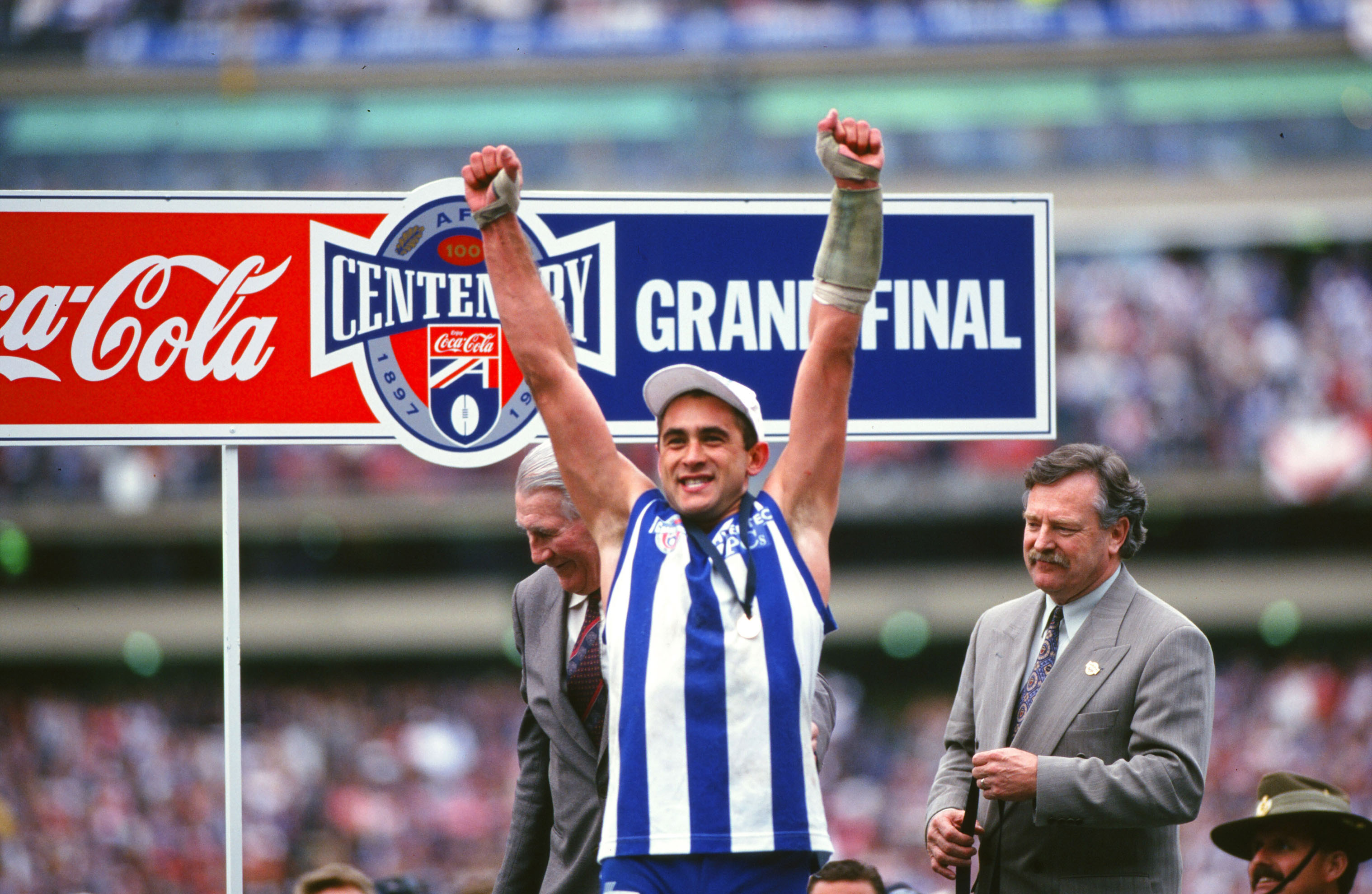 Wayne Schwass of North Melbourne celebrates after receiving his Premiership Medal at victory dias presentation after the 1996 AFL Grand Final between the North Melbourne Kangaroos and the Sydney Swans at the Melbourne Cricket Ground.